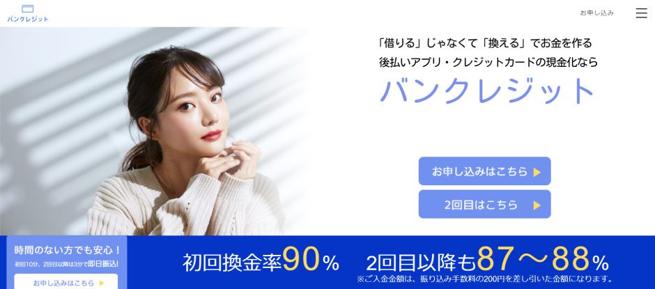 バンクレジットは、換金率86%~・入金時間最短3分というサービスクオリティが高い現金化業者です。