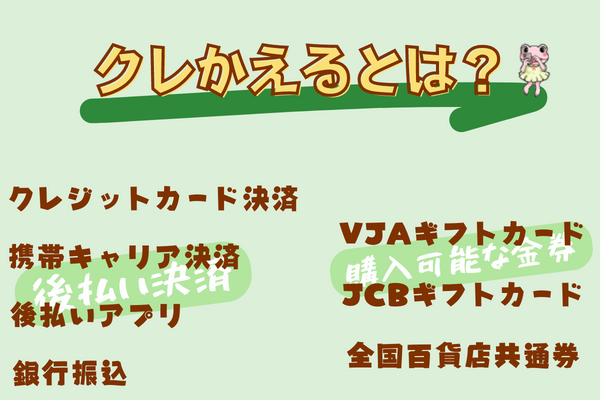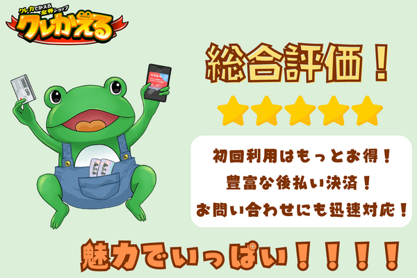 クレかえるは、クレカ・携帯キャリア決済・後払いに対応している数少ない金券ショップです。