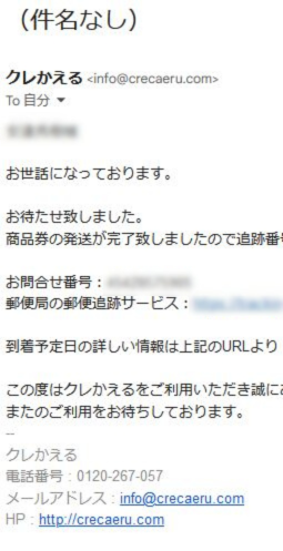 今回クレかえるの営業時間中に申し込みをしたところ、その日のうちに発送完了メールが届きました。