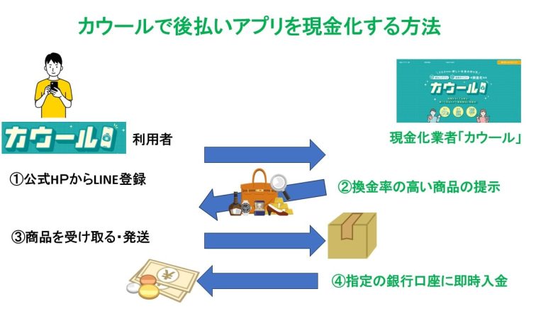 カウールで後払いアプリを現金化する方法は以下の通り。