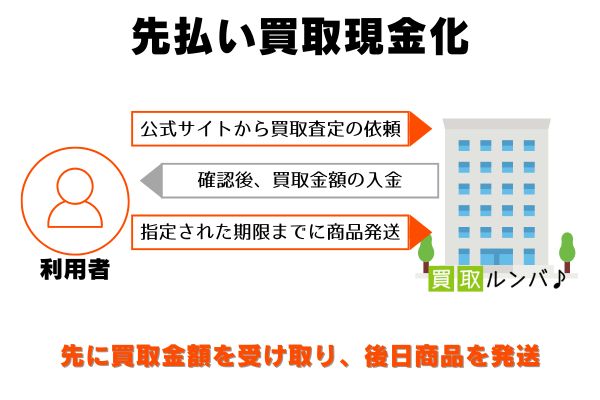 買取ルンバは買取依頼をしたい商品の写真を送るだけで、先に買取金額を受け取れる「先払い買取現金化」を採用しています。