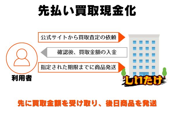 先払い買取現金化とは、事前に商品の買取代金を入金してもらい、期日までに商品を後日郵送することで取引が成立する便利なサービスです。